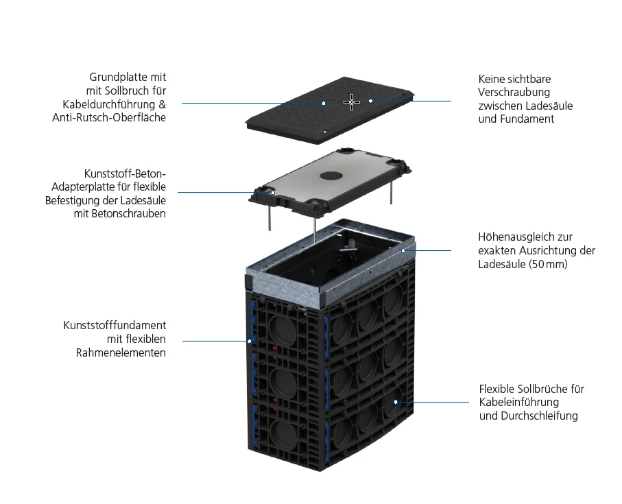 - Kunststofffundament und Ladesäule getrennt montierbar