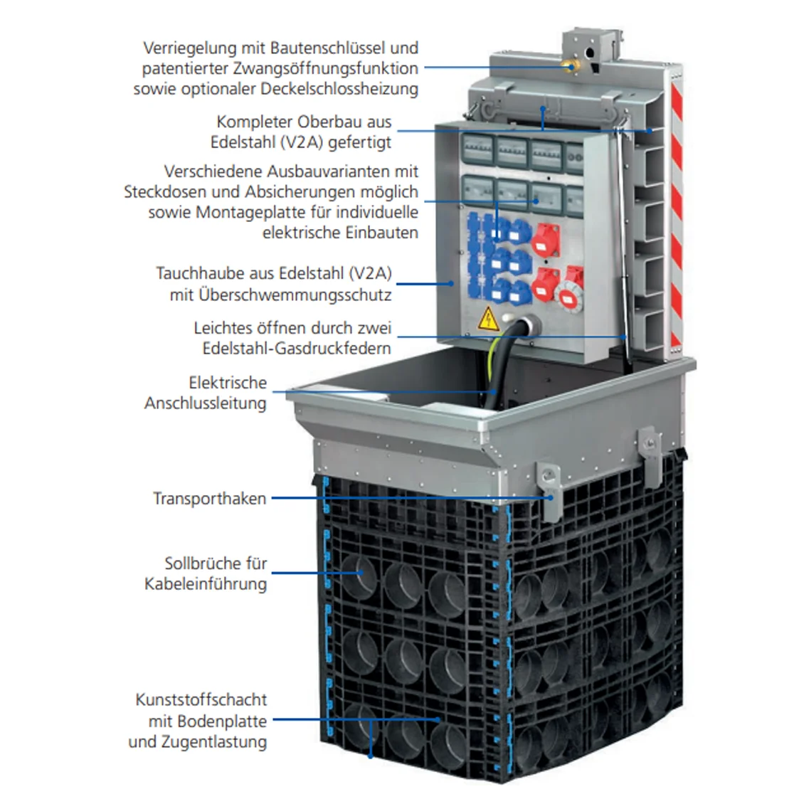 Unser Unterflurverteiler EK800 mit innovativem Schachtkonzept und modularem Aufbau für flexible Standortanpassung. Die robuste Konstruktion aus modifiziertem Polycarbonat gewährleistet Langlebigkeit und Widerstandsfähigkeit gegenüber Umwelteinflüssen. Die B125 Abdeckung bietet zusätzliche Sicherheit mit einer aufschwenkbaren Tauchhaube, bodenbündiger Verriegelung und Steckdosen mit Leitungs- und Personenschutz gemäß VDE Standards.