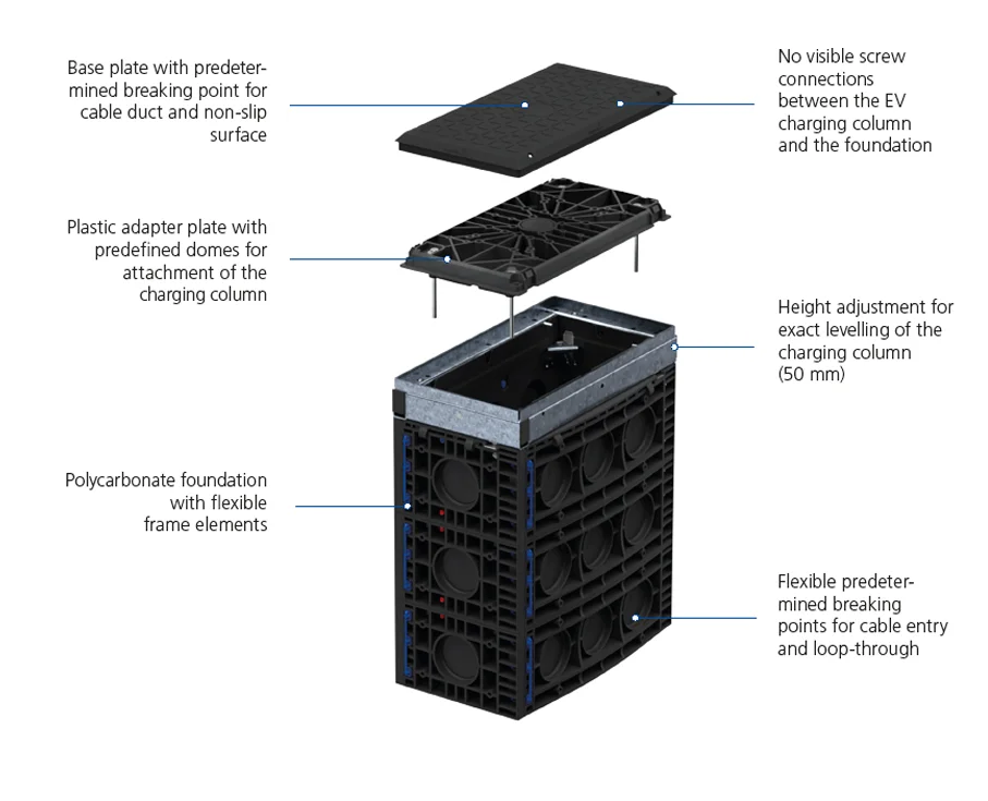 The efficient installation of charging columns is crucial when implementing charging infrastructure projects. As needed, the required charging columns can be gradually installed with these innovative, easy-to-install, flexible foundations.