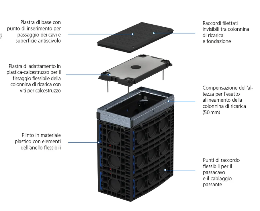 The plastic-concrete adapter plate set enables diverse charging columns to be installed. Separate from the civil engineering work required to install the foundation, the blank cover and adapter plate can be appropriately drilled on site when the charging column is to be installed.