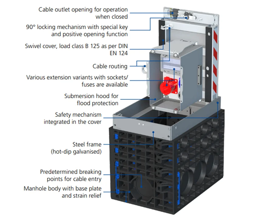 Our EK410 connect underground distributor features an innovative shaft concept and modular design for flexible site adaptation. The robust construction made of modified polycarbonate ensures durability and resistance to environmental influences. The B125 cover provides additional safety with a swiveling dome, flush locking mechanism, and sockets with line and personal protection according to VDE standards.
