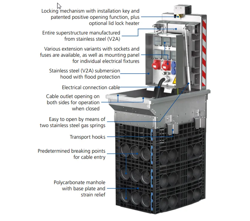 - Locking mechanism and cable outlet flush with the ground - No risk of tripping; secure cable routing with shear protection